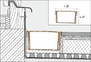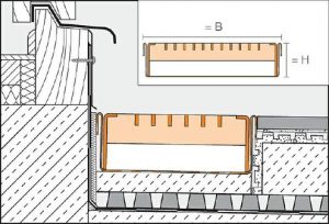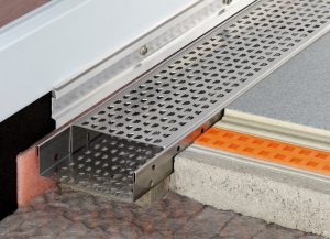 Schlüter®-TROBA-LINE drenážní žlab z nerezové oceli, který je možné osadit při nízkých výškách napojení dveří na balkonech a terasách, kde zabraňuje hromadění vody.
